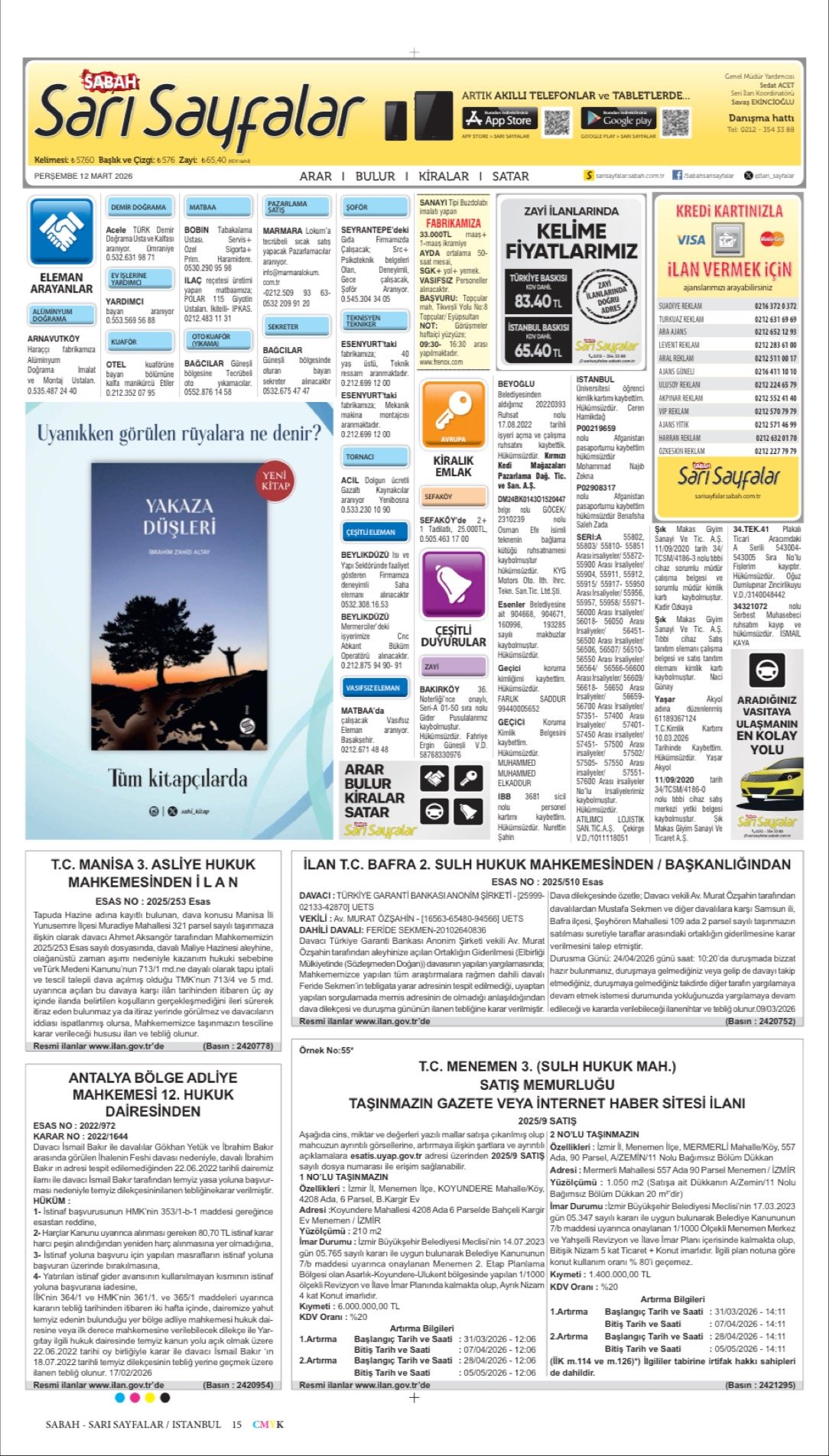 Sabah Bugünkü İş İlanları, Sabah Eleman, Sabah Kayıp İlanı, Sabah Sarı Sayfalar-12.3.2026