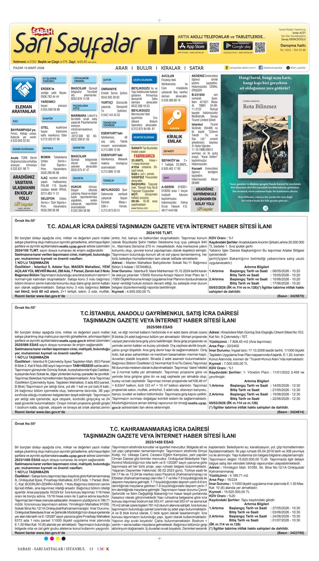 Sabah Bugünkü İş İlanları, Sabah Eleman, Sabah Kayıp İlanı, Sabah Sarı Sayfalar-15.3.2026