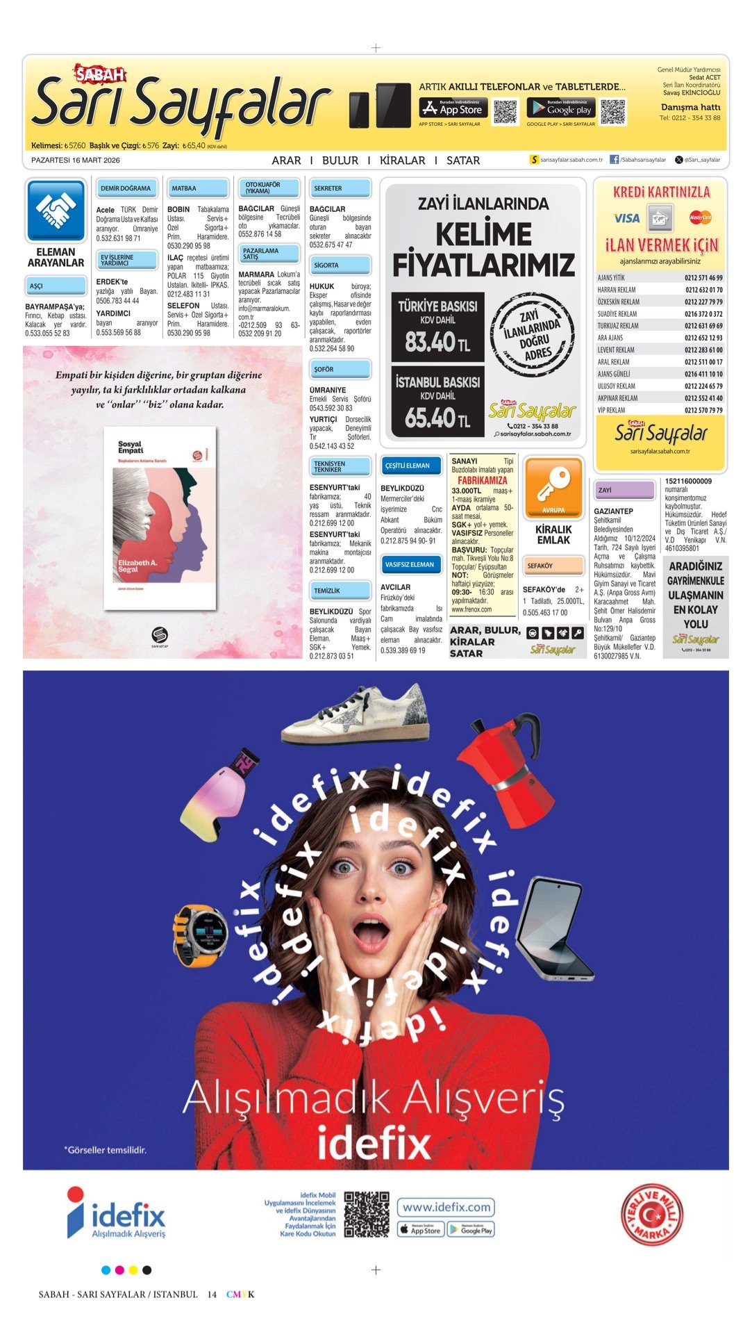 16.3.2026-Sabah Bugünkü İş İlanları, Sabah Eleman, Sabah Kayıp İlanı, Sabah Sarı Sayfalar.