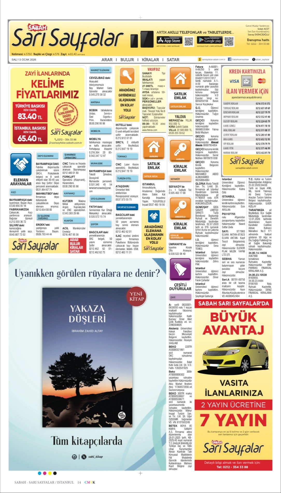 Sabah Sarı Sayfalar Bugünkü İş Eleman, Kayıp İlanlar-13-1-2026