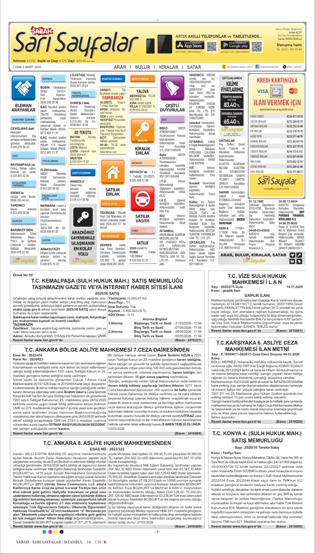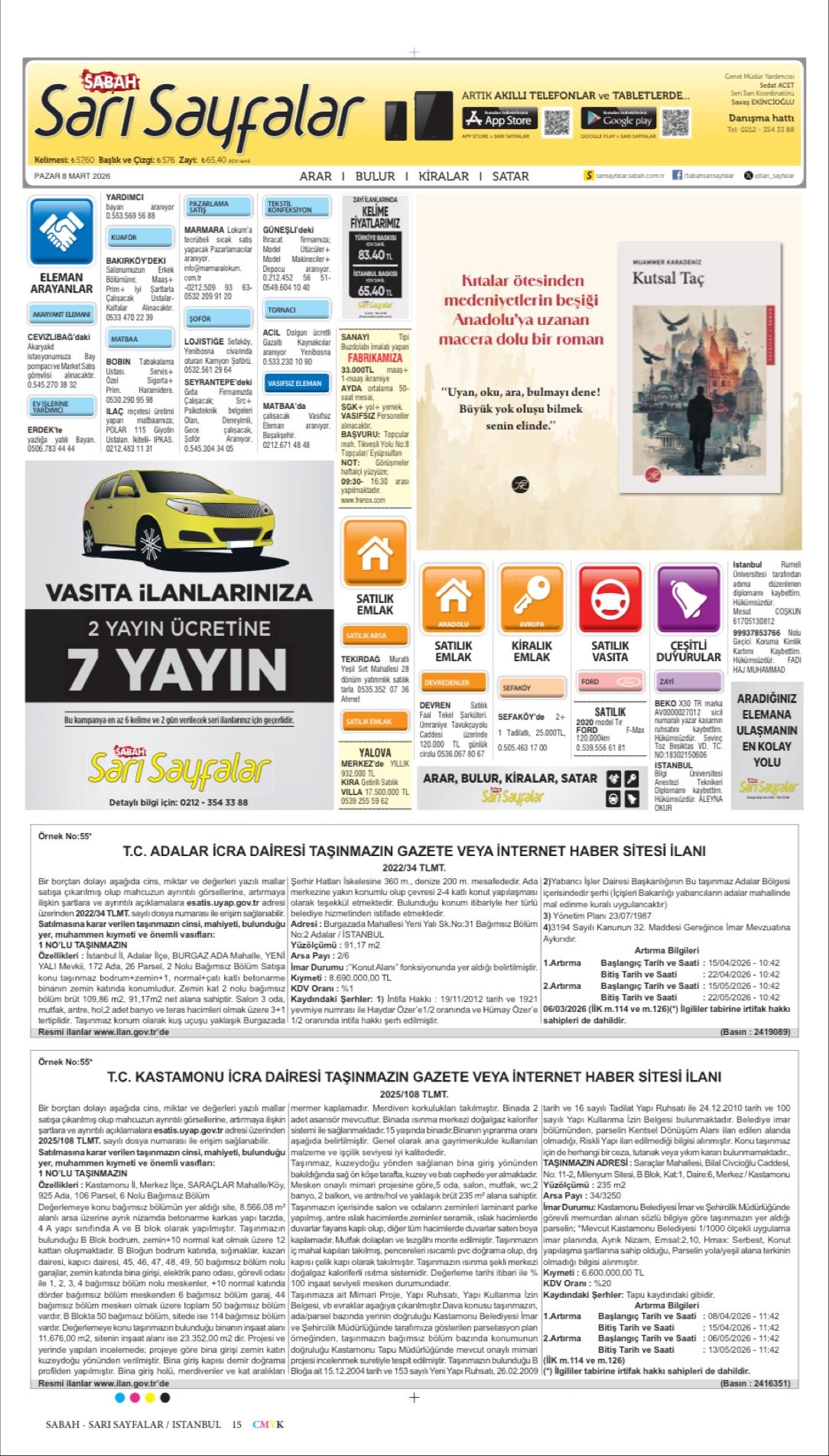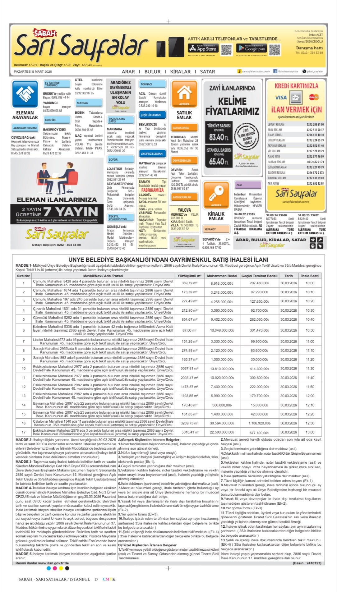 Sabah ilan reklam servisi web sitemizde, kayıp ilanları ve eleman arama ilanlarınızı hızlı ve güvenilir şekilde yayınlayabilirsiniz. Gazete ilanı gücüyle geniş kitlelere ulaşın.
